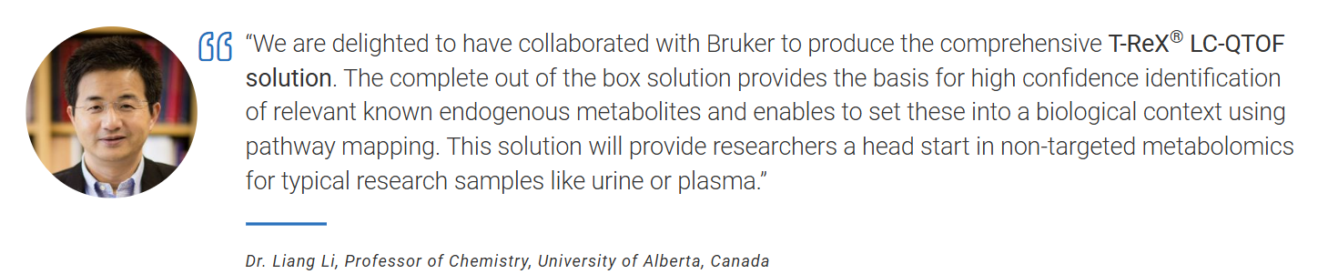 Prof. Liang Li 說:「我們非常高興能夠與Bruker合作,開發出全面的T-ReX® LC-QTOF解決方案。這一整套現成的解決方案為高可信度鑑定相關的已知內源性代謝物,並能夠將這些代謝物放入生物學背景中進行代謝路徑分析。這一解決方案將為研究人員在非標的物代謝體學領域提供先機,尤其是對尿液或血漿等典型研究樣本的研究。」