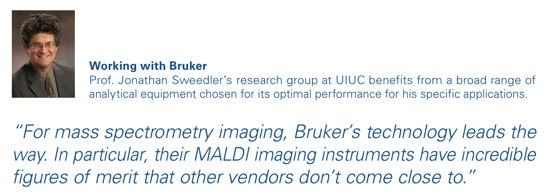 Prof. Jonathan V. Sweedler說:「我們使用Bruker的ultrafleXtreme™和solariX XR™進行影像質譜測量,ultrafleXtreme™可以處理大量樣品。Bruker儀器讓我們能夠探測到特定位置的內容物,例如海馬體層內的神經傳導物質、神經胜肽和脂質的變化。當涉及到影像質譜,特別是MALDI質譜時,Bruker的技術表現堪稱領先。」